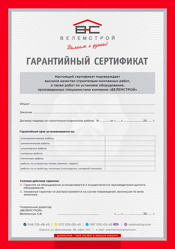 - После завершения ремонта каждый клиент получает гарантийный сертификат на все виды выполненных работ — срок действия до 5 лет