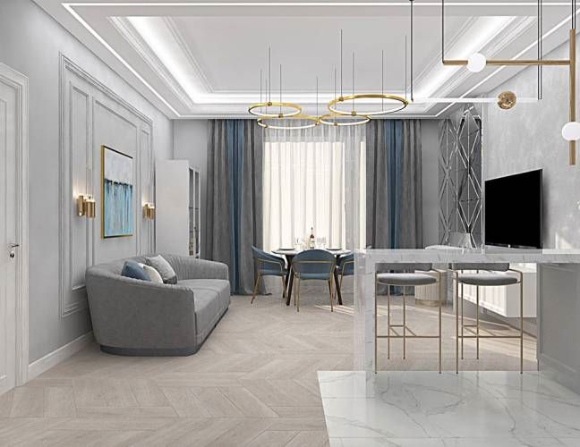З самої назви неокласика дизайн квартири вже зрозуміло, що цей стиль успадкував респектабельність і багатство класичного оздоблення в поєднанні з сучасними матеріалами та тенденціями. Таке рішення обстановки виглядає просторо, охайно та аристократично. Тобто такий стиль оформлення буде не найкращим варіантом, наприклад, для малогабаритної квартири. Але не хвилюйтеся. Наша команда готова розробити для вас проект незалежно від площі, щоб задовольнити ваші побажання.